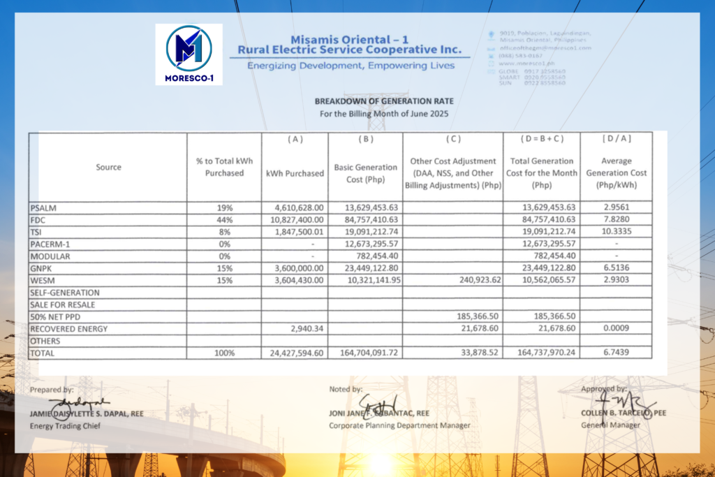 Arun klaro sa atong mga member-consumer-owners (MCOs) ang breakdown sa atong balayranan sa generation matag bulan karung tuiga ug sa umaabot, ania ang binulan nga “Breakdown of Generation Rates” o ang atong balayrunon sa kuryente ngadto sa mga independent power producers (IPP) o generation (suppliers) nga atong gi-angkatan sa kuryente niadtong bulan sa Hunyo 2025.