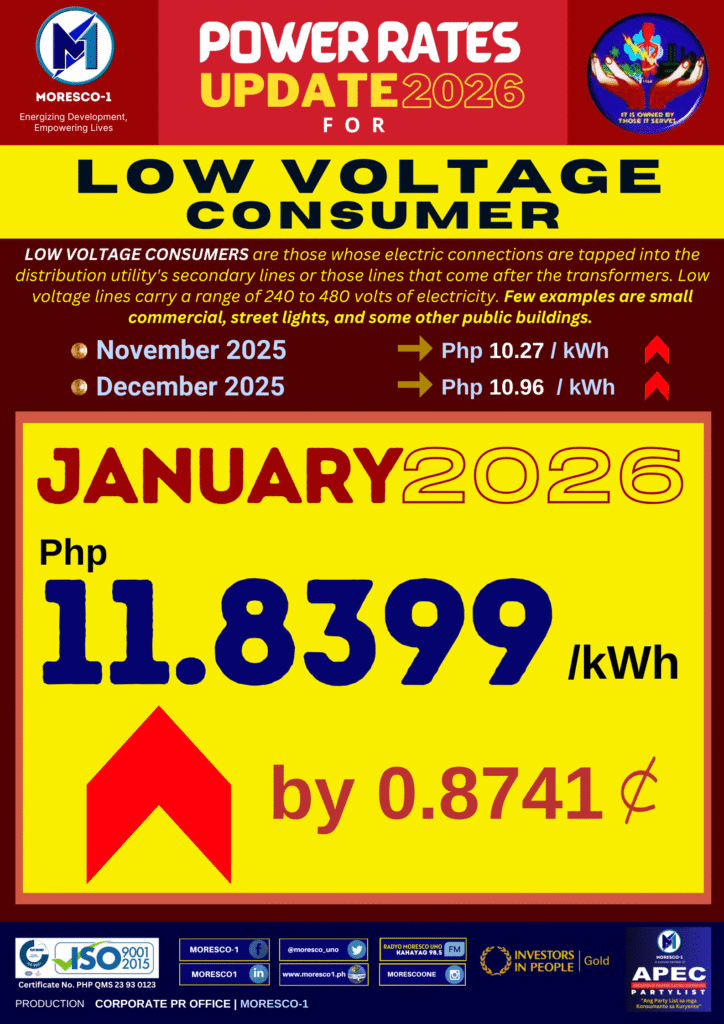 • Low Voltage Customers – adunay net increase nga PHP 0.8741/kWh, nga nagresulta sa epektibong rate nga PHP 11.8399/kWh.