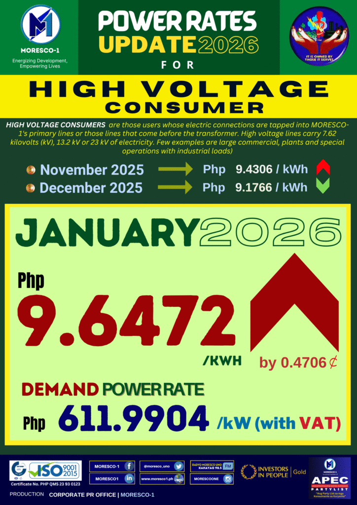 • High Voltage Customers – adunay usab net increase nga PHP 0.4706/kWh, nga may epektibong rate nga PHP 9.6472/kWh