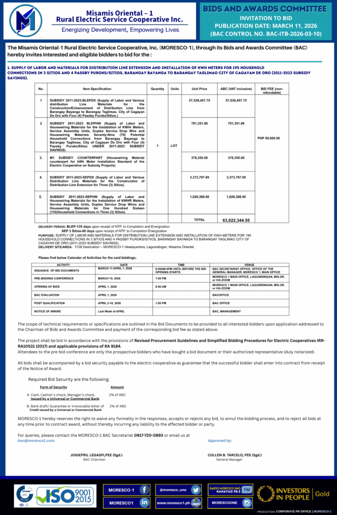 In a request letter addressed to MORESCO-1 General Manager Engr. Collen Tarcelo, SURNECO sought permission to conduct the verification activity at MORESCO-1 on December 16, 2025, as part of the mandatory post-qualification process under the Electric Cooperatives Procurement Guidelines, pursuant to NEA Memorandum No. 2017-019.