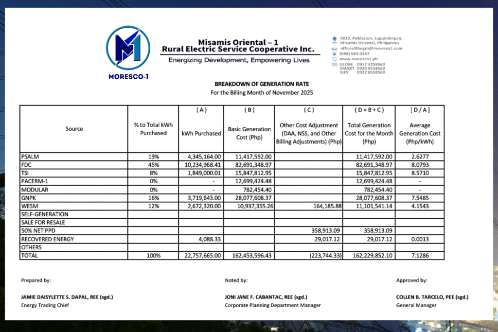 Arun klaro sa atong mga member-consumer-owners (MCOs) ang breakdown sa atong balayranan sa generation matag bulan karung tuiga ug sa umaabot, ania ang binulan nga “Breakdown of Generation Rates” o ang atong balayrunon sa kuryente ngadto sa mga independent power producers (IPP) o generation (suppliers) nga atong gi-angkatan sa kuryente niadtong bulan sa Nobyembre 2025.