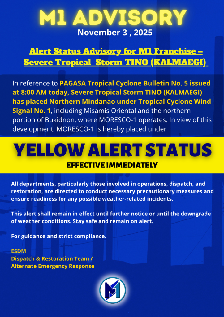 In reference to PAGASA Tropical Cyclone Bulletin No. 5 issued at 8:00 AM today, Severe Tropical Storm TINO (KALMAEGI) has placed Northern Mindanao under Tropical Cyclone Wind Signal No. 1, including Misamis Oriental and the northern portion of Bukidnon, where MORESCO-1 operates.