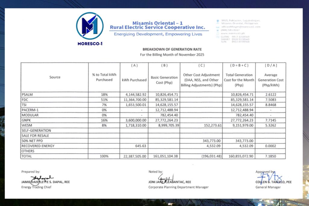 Arun klaro sa atong mga member-consumer-owners (MCOs) ang breakdown sa atong balayranan sa generation matag bulan karung tuiga ug sa umaabot, ania ang binulan nga “Breakdown of Generation Rates” o ang atong balayrunon sa kuryente ngadto sa mga independent power producers (IPP) o generation (suppliers) nga atong gi-angkatan sa kuryente niadtong bulan sa Disyembre 2025.