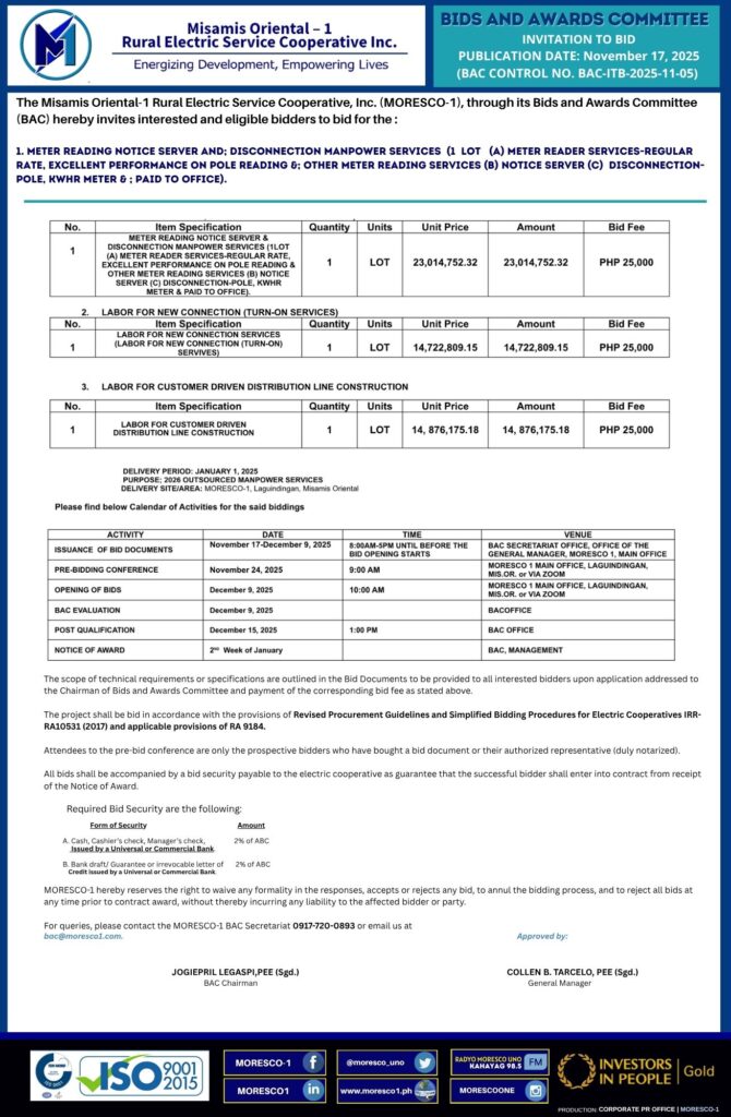 The Misamis Oriental-1 Rural Electric Service Cooperative, Inc. (MORESCO-1), through its Bids & Awards Committee (BAC), hereby invites interested and eligible bidders to bid for: