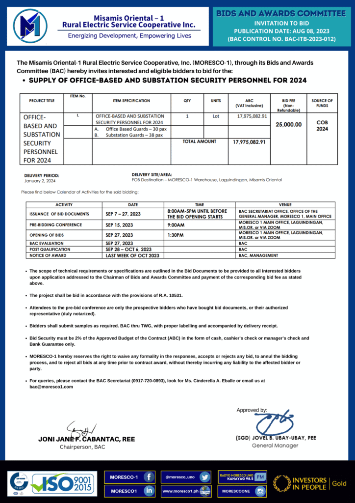 Bids and Awards 2023/Invitations to Bid BAC-ITB-2023-012 – SUPPLY OF OFFICE-BASED AND SUBSTATION SECURITY PERSONNEL FOR 2024 August 8, 2023November 14, 2025 admin