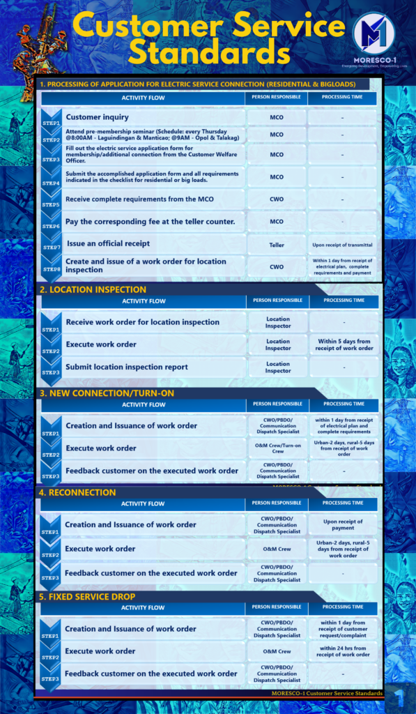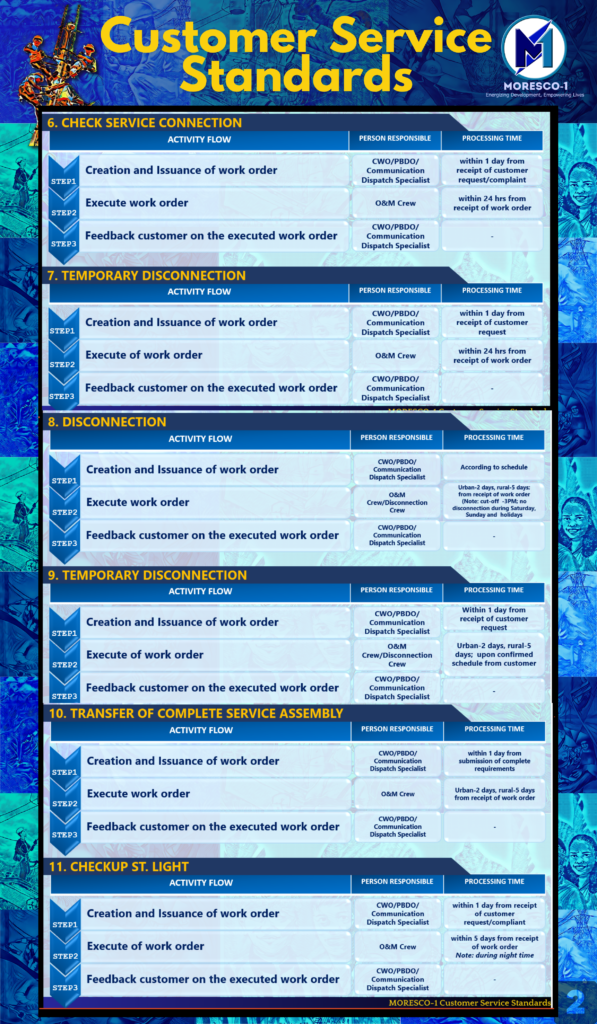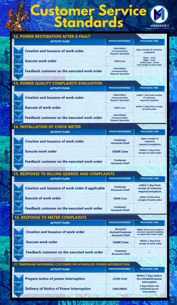 At MORESCO-1, we are committed to providing excellent service to our Member-Consumer-Owners (MCOs). Our goal is to ensure a seamless, transparent, and reliable experience in all aspects of your electric service. Below are the key customer service standards we follow: