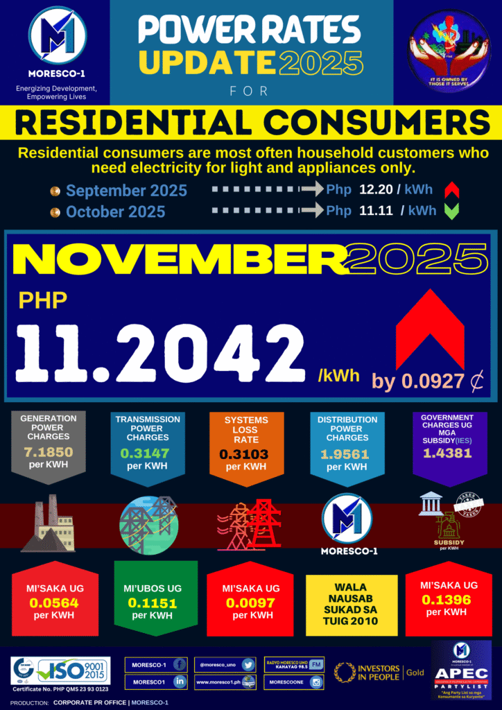 • Ang Low Voltage Customers makasinati ug net increase nga PHP 0.0275/kWh, nga mopadangat sa effective rate nga PHP 10.2756/kWh.