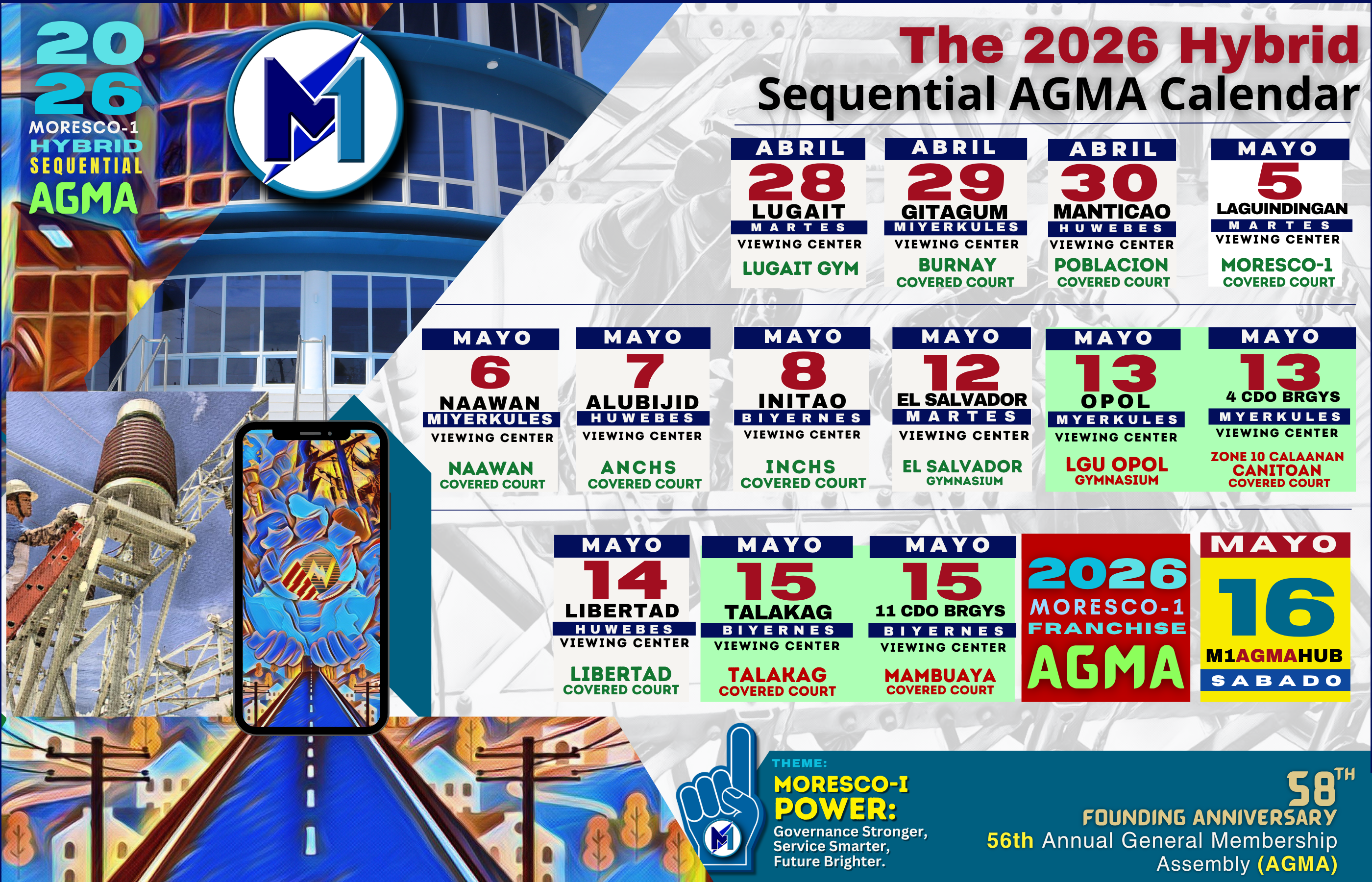 The Misamis Oriental-1 Rural Electric Service Cooperative, Inc. (MORESCO-1) formally announces the conduct of its 2026 Hybrid Sequential District Annual General Membership Assembly (AGMA), culminating in the Franchise-Wide AGMA on May 16, 2026 (Saturday) at the MORESCO-1 Covered Court, Laguindingan.