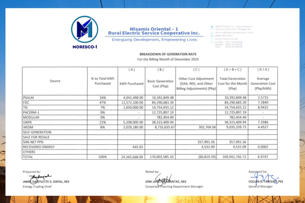 Arun klaro sa atong mga member-consumer-owners (MCOs) ang breakdown sa atong balayranan sa generation matag bulan karung tuiga ug sa umaabot, ania ang binulan nga “Breakdown of Generation Rates” o ang atong balayrunon sa kuryente ngadto sa mga independent power producers (IPP) o generation (suppliers) nga atong gi-angkatan sa kuryente niadtong bulan sa Disyembre 2025.