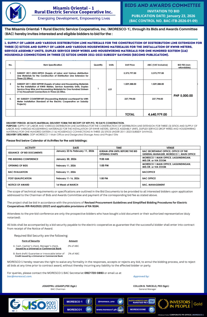 The Misamis Oriental-1 Rural Electric Service Cooperative, Inc. (MORESCO-1), through its Bids & Awards Committee (BAC), hereby invites interested and eligible bidders to bid for: