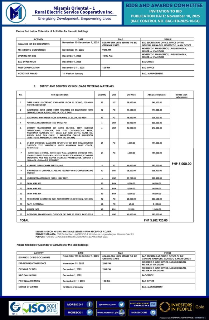 The Misamis Oriental-1 Rural Electric Service Cooperative, Inc. (MORESCO-1), through its Bids and Awards Committee (BAC) hereby invites interested and eligible bidders to bid for the :