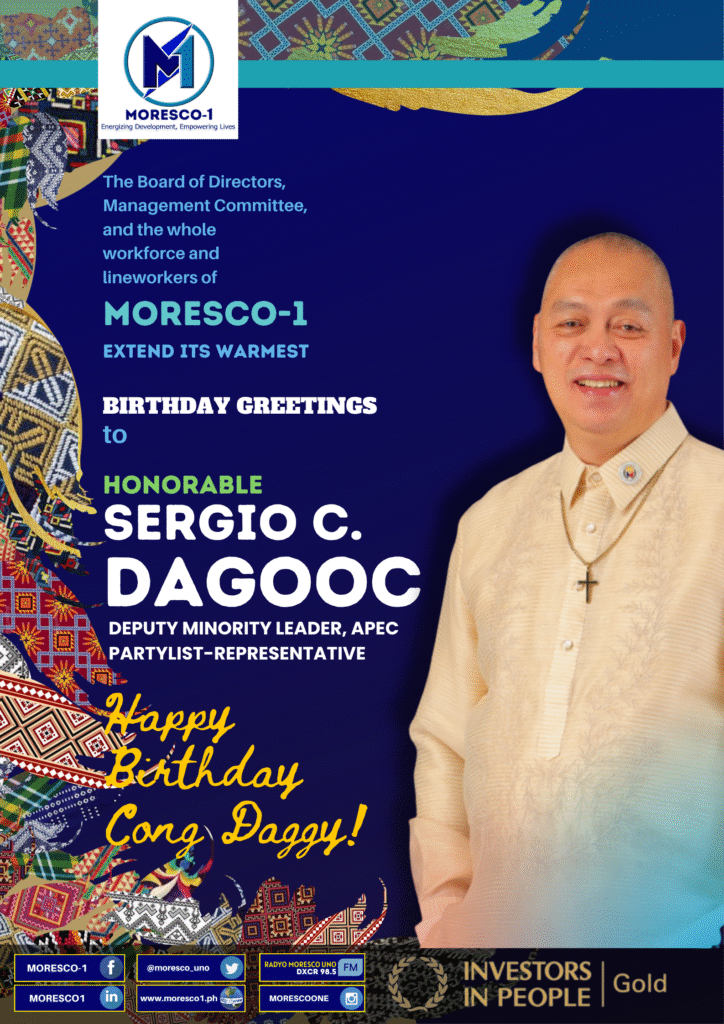 The Board of Directors, Management Committee, and the entire MORESCO-1 family extend our warmest birthday greetings to Honorable Sergio C. Dagooc, Deputy Minority Leader and APEC Partylist Representative.