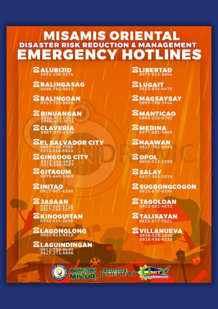 - NDRRMC (National Disaster Risk Reduction and Management Council): (02) 8911-5061 to 65