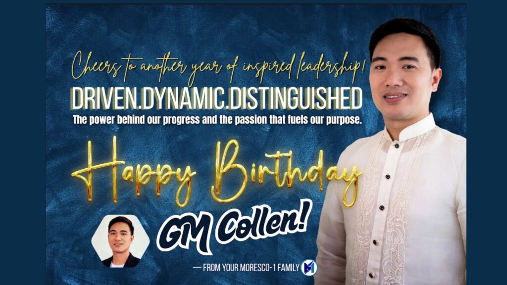 Happy Birthday, GM Collen! Today we celebrate not just your special day but also the leadership, kindness, and inspiration you share with MORESCO-1. Wishing you good health, laughter, and more milestones ahead. Enjoy your day to the fullest!