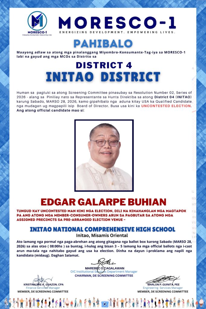 Human sa pagtuki sa atong Screening Committee pinaagi sa Resolution Number 2 Series of 2026 alang sa Piniliay nato sa Representante sa Hunta Direktiba sa atong District 4 (Initao) karung Sabado, Marso 28, 2028, kamo gipahibalo nga aduna kitay usa ra ka Qualified Candidate nga mudagan ug magpa pili isip Board of Director. Busa usa kini ka UNCONTESTED Election. Ang atong official candidate mao si: