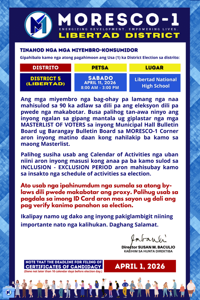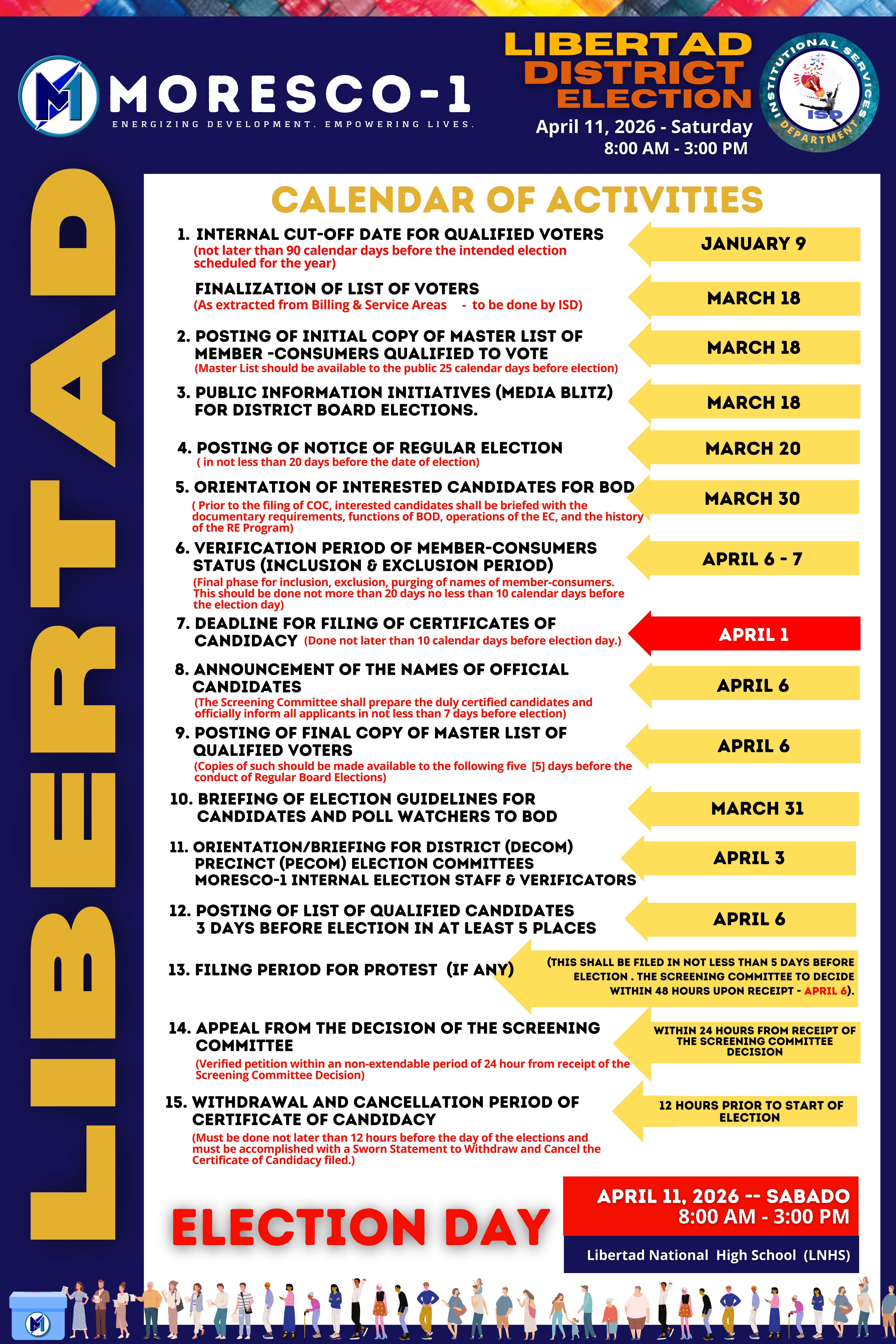 Giawhag ang tanang kwalipikadong MCO nga motan-aw sa Masterlist of Voters nga gipahimutang sa Municipal Hall Bulletin Board, Barangay Bulletin Boards, ug sa MORESCO-1 Corner aron masiguro nga ang inyong ngalan nakalakip sa listahan sa mga botante. Hinumdumi nga ang mga bag-ong miyembro nga wala pa makakompleto og 90 ka adlaw nga pagka-miyembro sa dili pa ang eleksyon dili pa mahimong makabotar.